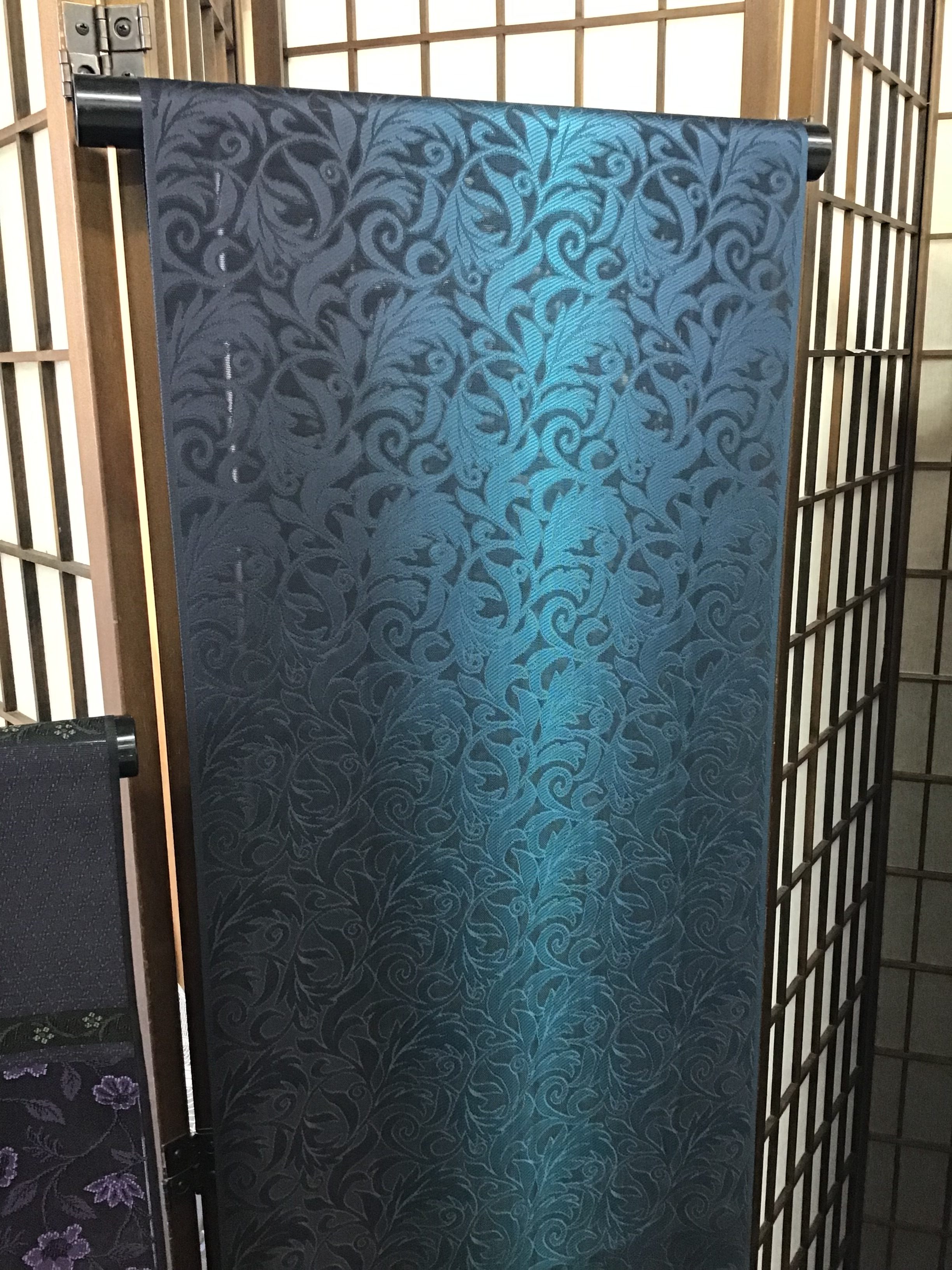 先染めした縦糸をグラデーションになる様に並べて透かしを入れて織ってある着尺。とても深みがありますね。